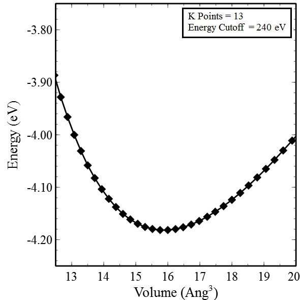 Energy versus volume curve using fully converged values of the energy-cutoff and K-point parameters in model simulations. ~S. Brauer, J. Carrillo, J. Hughes, W. Song