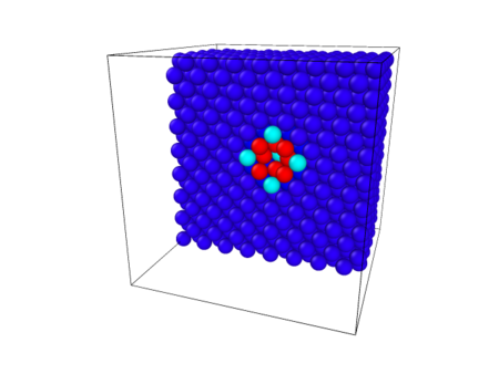 The simulation can be visualized using OVITO (www.ovito.org; developer: Alexander Stukowski). To do so, first open the Ovito program and select the import data tab. Then go to the directory and file in which you ran the simulation. Locate the first dumpfile, which would be dump.relax.1.0 in this case. You can then double click on the file, or select the file, then click open. The image of the cell should appear on the screen, displayed in four views, Figure 1. This image will be that of the relaxed cell before introducing the vacancy. To view the cell after vacancy has been created, follow the same steps above to select the dump file at the end of the relaxation which followed the atom removal (these files are labeled dump.relax.2.*. Once you open the new file, select one of the four views. Then open the add modification tab and from the drop down menu select Slice. Set the Normal (X) to 1 and set Normal (Y) and Normal (Z) to 0. Return to the add modification tab and select Color coding. When here select c_eng for the Property. Then select Rainbow for the Color gradient and click Adjust range. The vacancy should be visible in the center of the cell, colored by the energy surrounding the vacancy, see Figure 2.