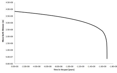 Knowing the current values for \dot{\alpha} = 3.8 \times 10^{-2} m/year and \alpha=3.84 \times 10^8 m we can compute the constant of proportionality to be:  6.25 10^45 m^{13/2}/year . From there we can run the calculation backwards and compute the Earth-Moon distance at different times in the past. The result is visualized on Figure 3.