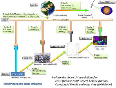 At the lowest length scales, we would run electronics principles calculations using density functional theory (DFT) techniques to obtain values for μ and k for the various materials and phases in which we are interested (salt water, granite, olivine, liquid/solid iron+nickel). This information would be passed to the macroscale (Bridge 4). In addition, the DFT simulation would also give us interfacial energy parameters which can be used in the higher length scale computation (Bridge 1) for obtaining values of viscosity (for liquids) or dislocation mobility parameters (for solids).