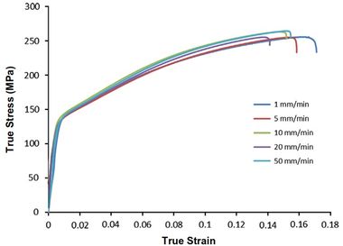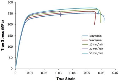 Figure 7. Tension tests in RD direction at various displacement rates. The yield stress and the ultimate strength increase as the displacement rate increases while ductility remains constant.