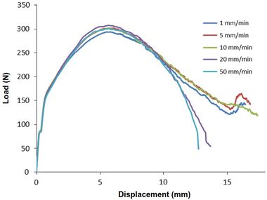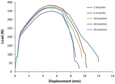 Figure 4. Three-point bending results of the RD specimens at different displacement rates. The specimens at the higher displacement rates failed but did not crack at lower rates