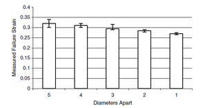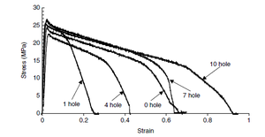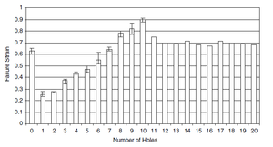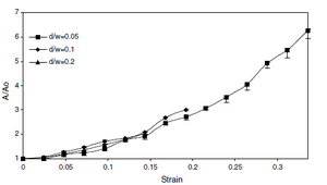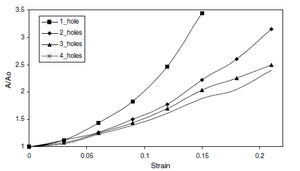 Void area evolution for increasing strain was examined for specimens with pre-existing holes. Varying the strain rate for specimens with a single hole resulted in a decreasing strain to failure for increasing strain rate as shown in Figure 5. Tests for specimens with various initial hole sizing resulted in little discrepancy between void growth for similar strains but specimens with larger initial holes tended to have lower strain to failure (Figure 6). The last set parametric experiment involved comparing the effects of the number of holes in the test specimens. The study in Figure 7 shows that a lower numbers of holes resulted in increased void growth rates and decreased strain to failure values. |