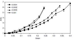 MethodologyDog-bone specimens of a rolled 63Sn-37Pb alloy were subjected to material testing. Scanning electron microscope (SEM) techniques were used to examine the material microstructure. The major material phases were determined to be Pb-rich particles and Sn-rich matrix material via chemical spectrum analysis. The microstructure was determined to be random with no discernable phase anisotropy. Some of the specimens were drilled along the centerline of gauge section parallel to the loading axis in order to study void growth mechanisms. The specimens were tested under constant applied strain rates in Instron tensile testing machines. The evolution of hole deformation in the specimens was recorded via digital camcorder and digital imaging software was used to calculate the evolution of void area with changing strain. Plots were generated for the void area vs. strain and are shown in Figure 1. | |