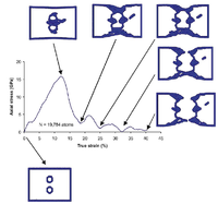 Figure 5 shows the dislocation motion as a function of the stress-strain response indicating a yield stress of 18.92 GPa (at 14.9% strain) for the lowest material length scale (N=5052 atoms) for two-void specimen. The dislocation nucleates in the ligament region between two voids. The ligament region shrank with the increase in applied strain and the voids coalesced. Afterwards, the dislocation moved towards the edges of the specimen causing the initial necking. Figure 6 presents the stress-strain curve for next increasing length scale with N = 19,784 atoms. The yield strength decreased to 15.37 GPa with a corresponding total true strain of 12.11%.