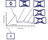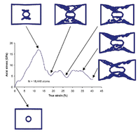 The void growth phenomena were captured in the study using molecular dynamics principles. For the purpose of studying void growth mechanisms, a strain rate of 1010/s was considered. The specimens were loaded with uniaxial tension until total applied strain reached 41% true strain. The failure of material was seen in both single void and two void specimens. Figure 3 shows the stress-strain curve of the one-void nickel specimen with N = 4,408 atoms indicating the stages of the specimens' internal evolution of damage. From Fig. 3, it can be observed that uniaxial stress-strain response for one-void specimen at the lowest material length comprises an elastic portion up to a true strain 14.5% and a value of the yield strength of about 20.5 GPa. Void nucleation and void growth lead to the increase of void volume fraction. The stress resistance of specimen decreased significantly to about 5 GPa at the final true strain of 41%. The necking starts at about 25% strain level. Figure 4 presents the stress-strain response for the one-void specimen and the next largest specimen size (N = 18,448 atoms). Fig. 4< shows that the dislocation pattern for the larger specimen is different than the dislocation pattern for smallest material length scale. The point of dislocation nucleation varies as the material length scale is changed. Another observed feature is the change in aspect ratio of the changing void.