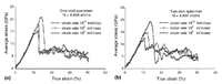 Fig. 12. Influence of strain-rate on the average stress versus true strain response for: (a) one-void specimen (N = 4880 atoms); (b) two-void specimen (N = 5052 atoms).
