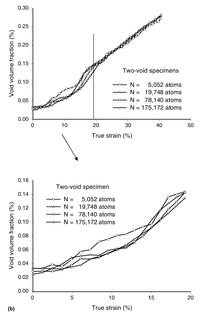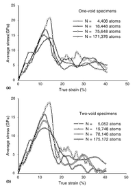 Figure 9 shows a comparison of stress-strain responses of one-void specimens and two-void specimens for different specimen sizes. Fig. 9(a) demonstrates that the initial yield decreases monotonically from 20.5 to 14.5 GPa as the specimen size increases from 4408 to 171,376 atoms. After the initial yielding, the stress-strain response exhibited a sharp stress drop-off. Fig. 9(b) indicates similar response for two-void case with a yield decrease from 18.92 to 12.2 GPa, as the specimen size increases from 5052 to 175,172 atoms. Figure 10 illustrates that the initial yield strength for the two-void specimens is consistently lower than the initial yield strength for the one-void specimens. Also from Fig. 10, the lowering of stress-strain curve for the two-void specimens than for the one-void specimens was observed.